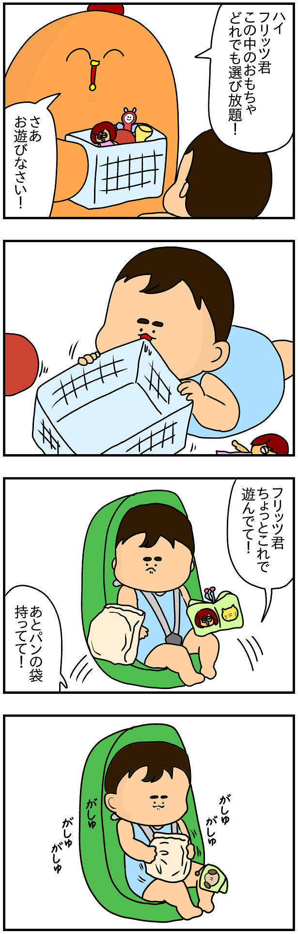 音が鳴るおもちゃをあげればそれよりもがしゅがしゅ音が鳴るパンの袋