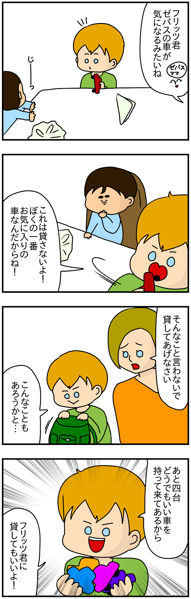 「一番お気に入りの車を持って行きたいけど、フリッツ君に貸せって言われるかもしれないから、貸してもいい予備の車を持って行こう」って考えられるの超かしこくないですか?(叔母バカ)