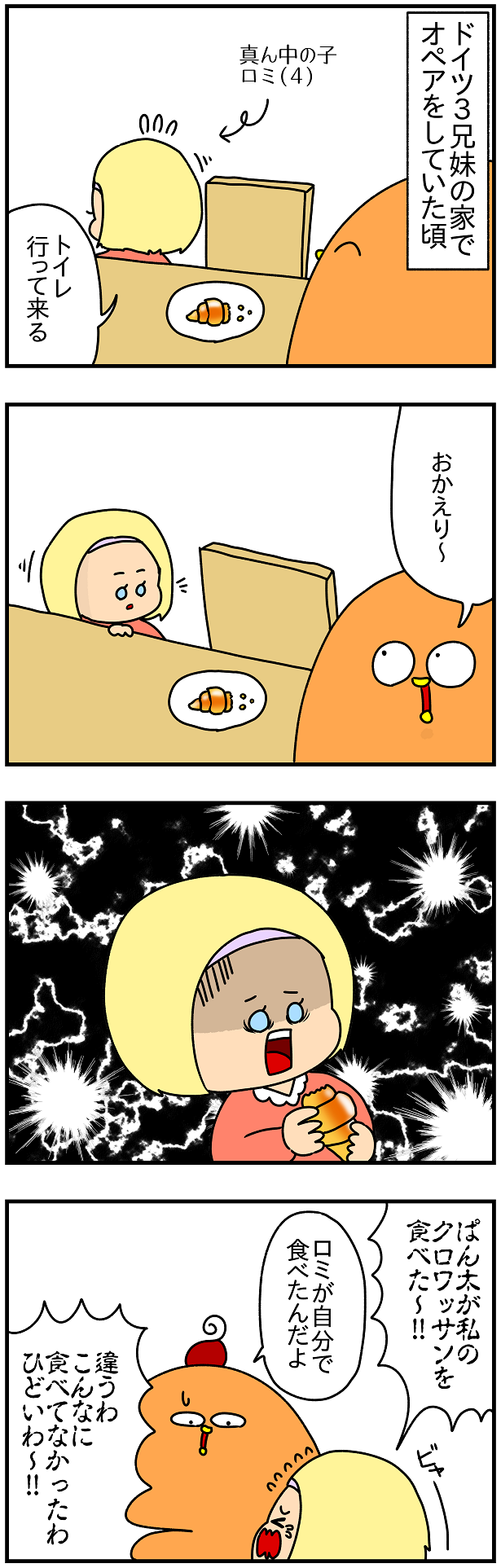 もうこのくらいの年頃の子供って本当に理不尽なもんで、「トイレに行く前に比べてクロワッサンが減ってる気がする!!」って思い込んじゃったらもう、どう説明しても納得してくれないんですよねwww