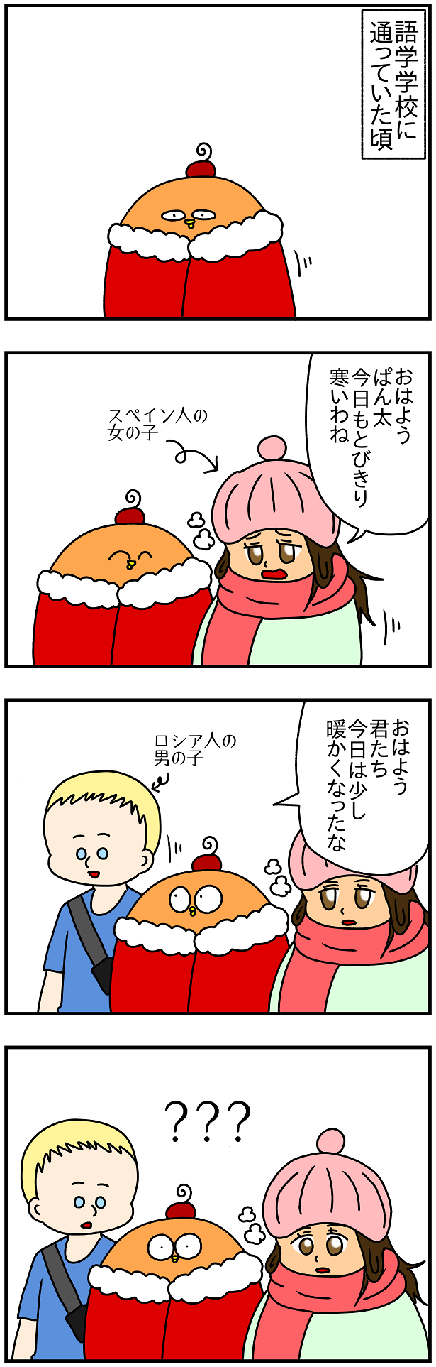 情熱の国スペインから来た子が厚着をして震えている横で、極寒の国ロシアから来た男の子が半袖Tシャツで平然としている光景は非常にシュールで面白かったwww