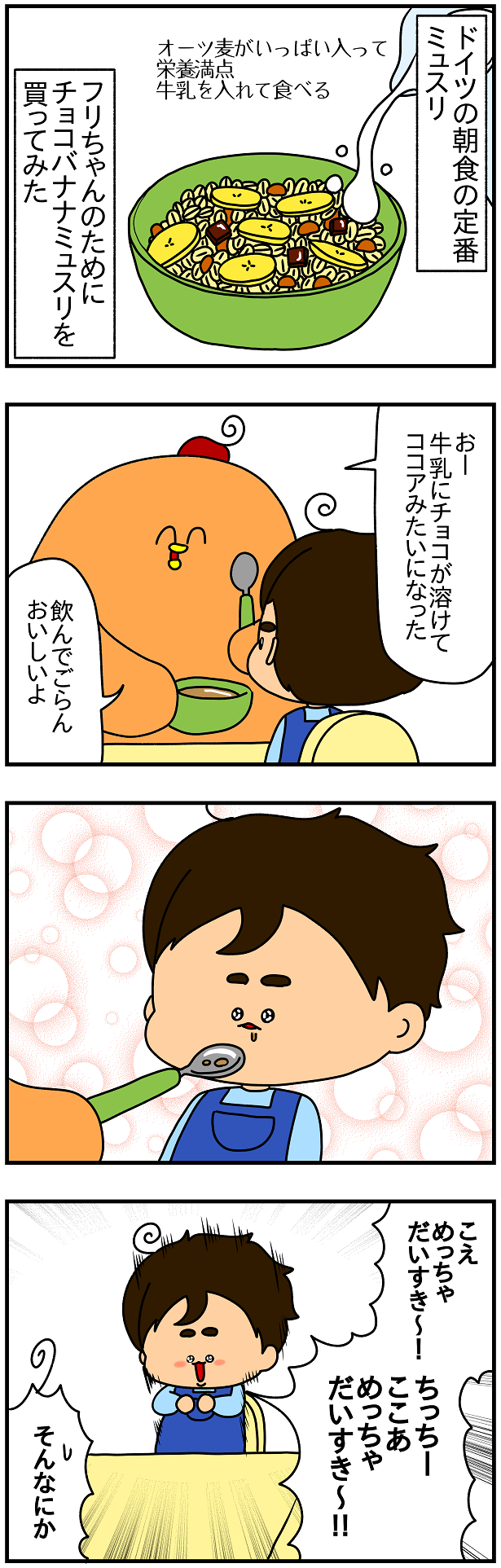 ドイツの朝ごはんの定番、Müsliっていうのがあって、要するにオーツ麦においしいもの(色んな種類がある。チョコとか乾燥フルーツとかナッツとかシナモンとか)が混ざったやつなんだけど、日本にもあるのかなぁ。あったらオススメ。