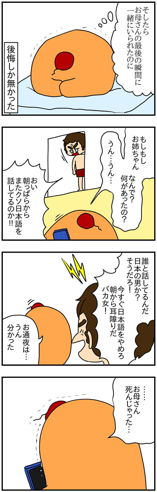 分かりにくいけど、7コマ目までのわたしのセリフは日本語でお姉ちゃんと話してて、8コマ目はドイツ語で元夫に向かって言ってます。
