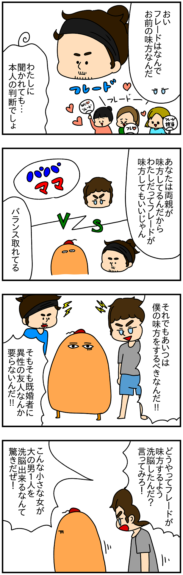「お前がフレードを洗脳したんだろう、そうじゃなきゃ100%悪いお前の味方をするはずがない」っていうわりとびっくらぽんな考えだった。そんなカリスマ性わたしには無いわ。