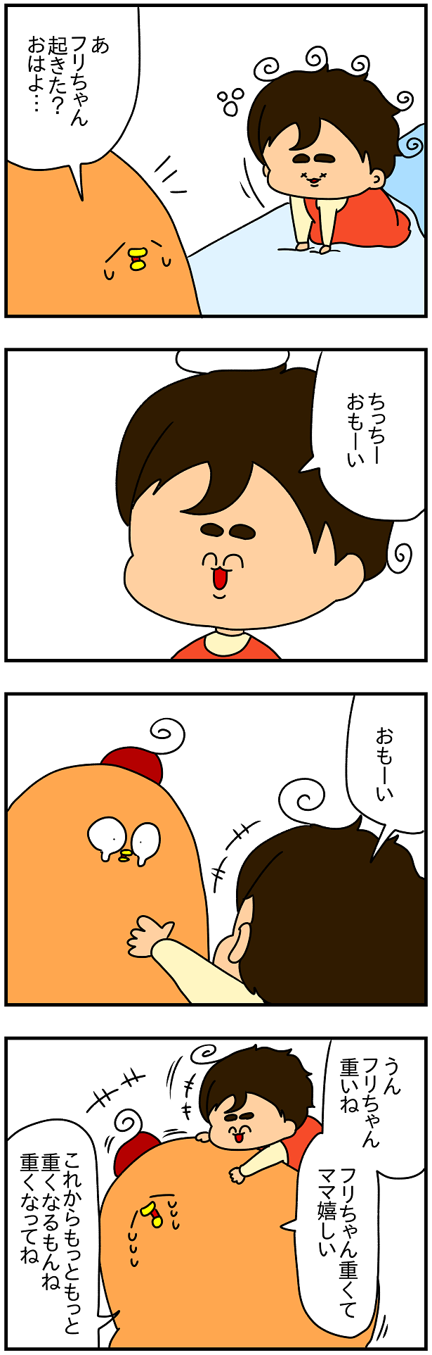 まあ、この夢を見た直後にフリちゃんが朝起きて開口一番に「おもーい」って言ったっていう一見不思議なエピソードなんだけど、真相をネタバレしちゃう。