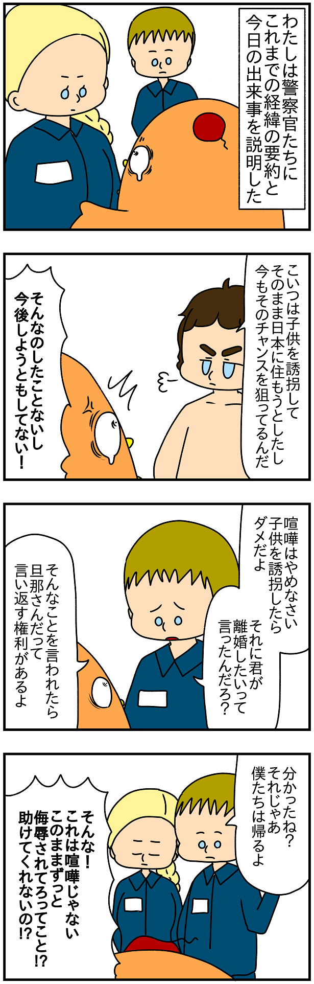 わざわざ起きるまで待って、正々堂々と「連れて行かせてください」ってお願いしたのに、元夫の中ではそれらが全部「誘拐未遂」扱いになってて草も生えない。