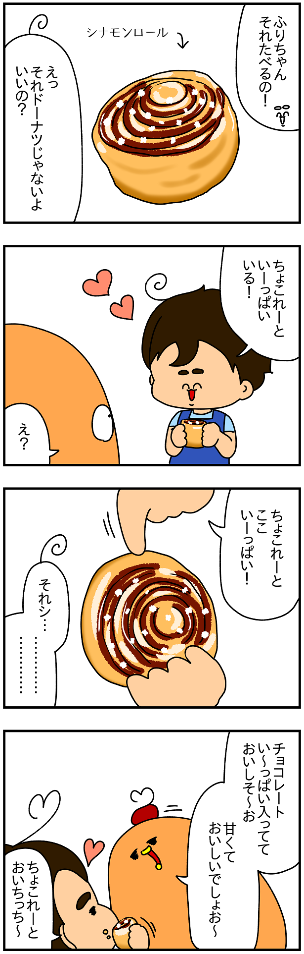 最初、どーなつ食べるの!って言ってたフリちゃんが、シナモンロールを見た瞬間に心変わり。