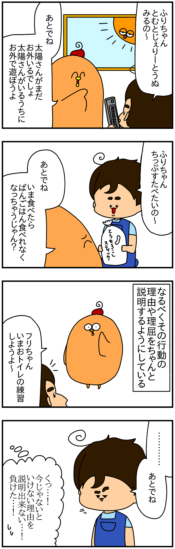 個人的なこだわりで、わたしは子供が理解出来る・出来ない、納得してくれる・してくれないに関わらず、とにかくちゃんと理由を説明したい。