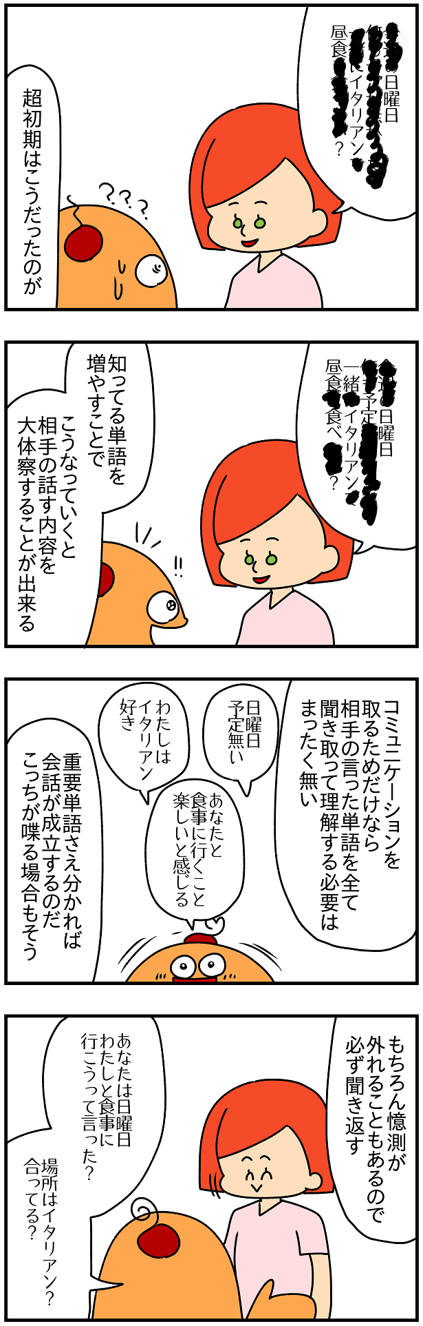 例えば↑の例みたいなので言えば、「わたしへの食事のお誘いだと思うんだけど、でもひょっとしたら"日曜日に誰かと一緒にイタリアンに行く予定なの"って言ったのかもしれない。もしそうだったら"わたしをイタリアンに誘ったの?"なんて聞き返すのは自意識過剰みたいで恥ずかしい…!どうしよう…!」って一瞬迷っちゃったりするの。