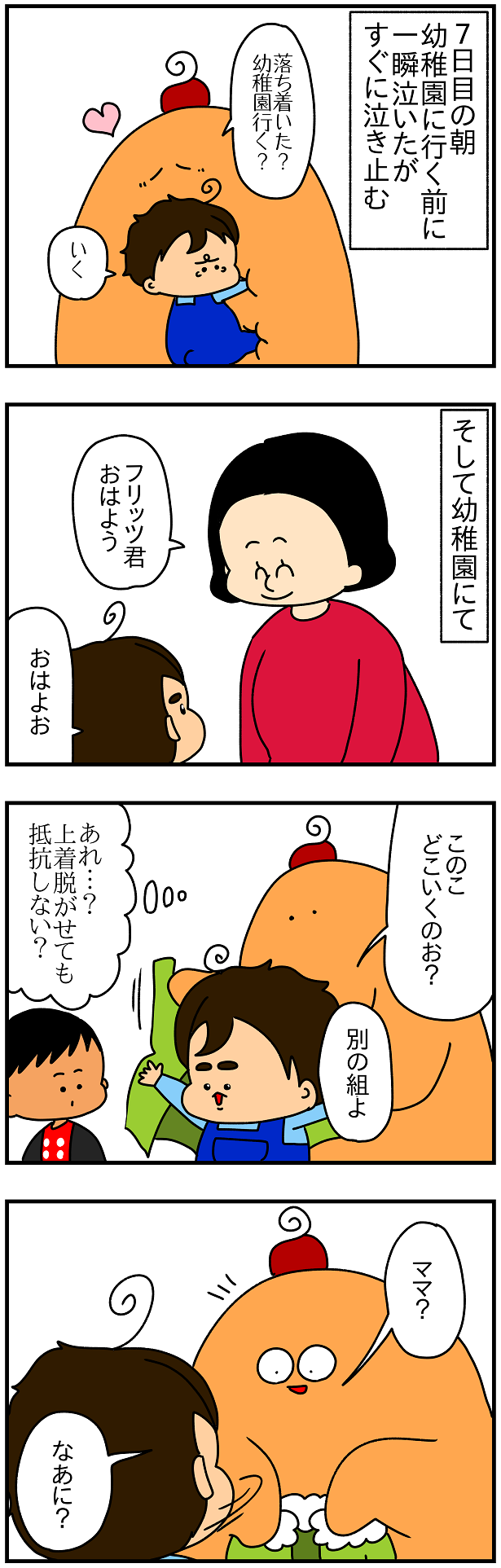 そして7日目にしてついに…幼稚園に行っても泣かない。上着を脱がせても泣かない。さらに…?