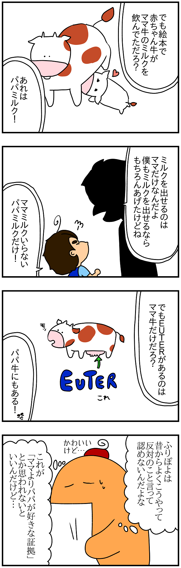 それが「ママ牛と赤ちゃんじゃなくてパパ牛と赤ちゃんと主張するのは父親のことのほうが好きだから」なんて解釈されないか、心配になった…。この心配が的中するかいつか後の記事で分かります。