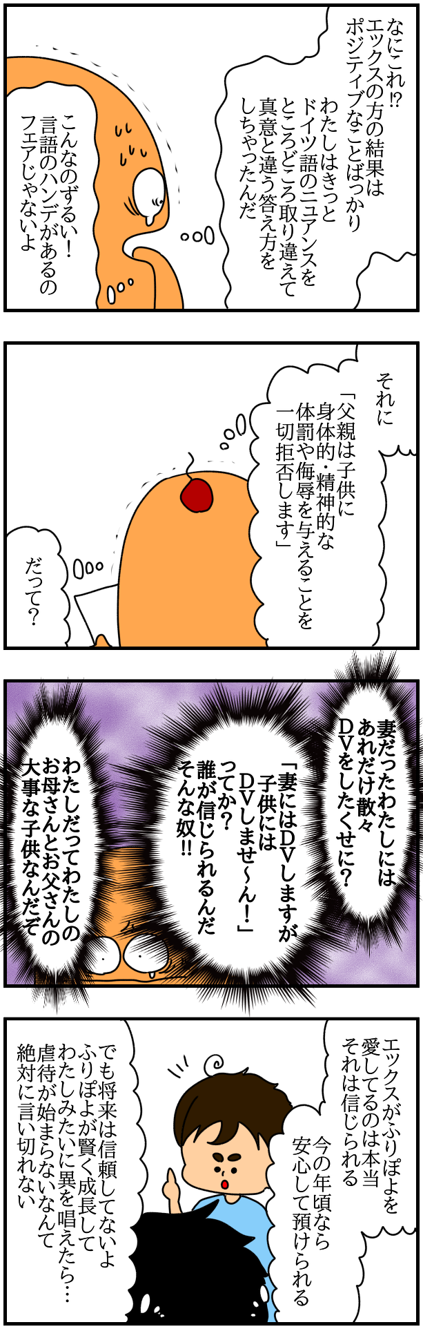 それと同じで、エックスが「俺、妻はDVして自殺直前まで追い詰めたけど、子供にはそんなことしないから安心しろよな!」って言っても信用しないし、「子供に肉体・精神的な虐待をすることなんてとんでもない!」って言っても「でも他の人の子供であるわたしにはしたじゃん」って思う。それだけ。
