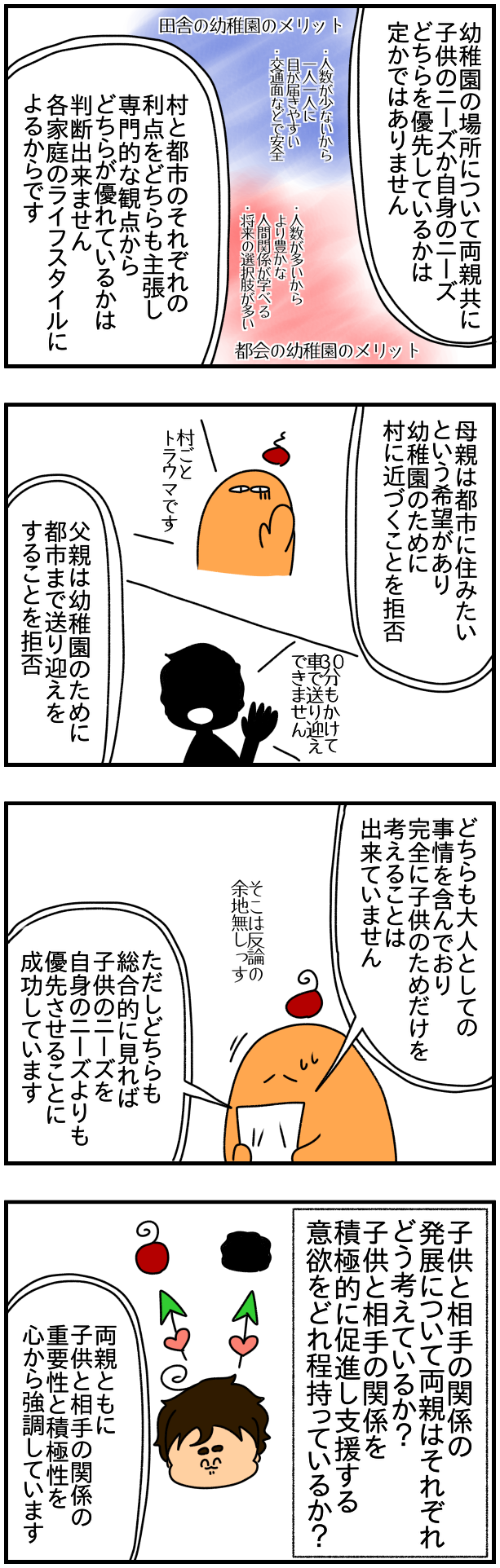1コマ目の「都会の幼稚園のメリット」の中の「将来の選択肢が多い」についてちょっと補足するけど、これはもちろん幼稚園の時点で将来の幅が決まるってわけじゃなくて、弁護士さん曰く、子供は基本的に行った幼稚園と同じ町の小学校に進む(お友達とかそういう関係で)から、わたしの希望する「町の幼稚園に行く」はイコール「そのまま町の小学校やそれ以降の学校に進学する」ってことだから!