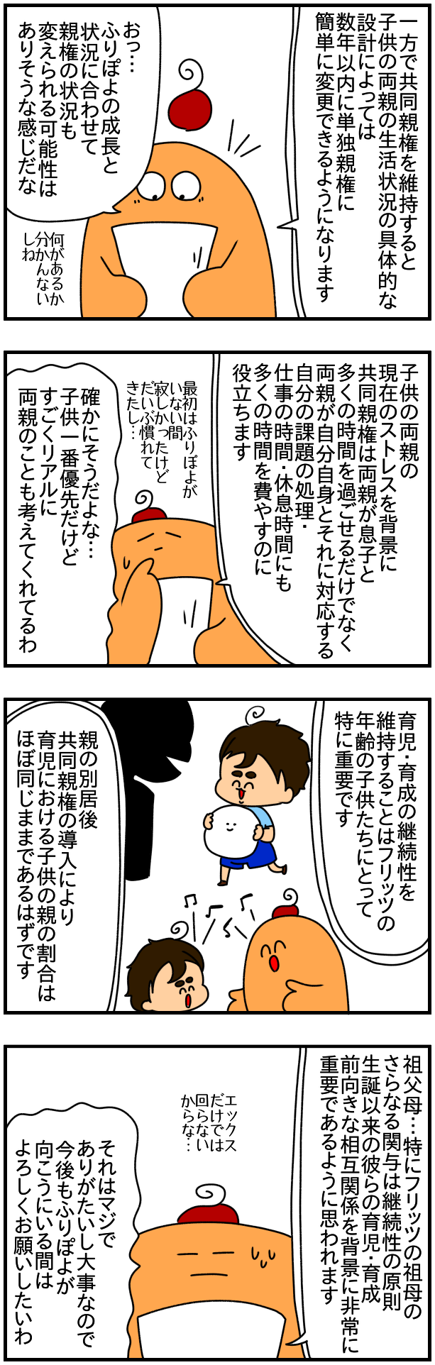 それから、これまでにも「親権割合は今回決まったら今後ずーっと変更無しなの!?ふりぽよが成長しても!?😨」って質問を何回かもらったんだけど、5コマ目にある通り「ふりぽよの状況に応じて変更される可能性はある」っぽい!