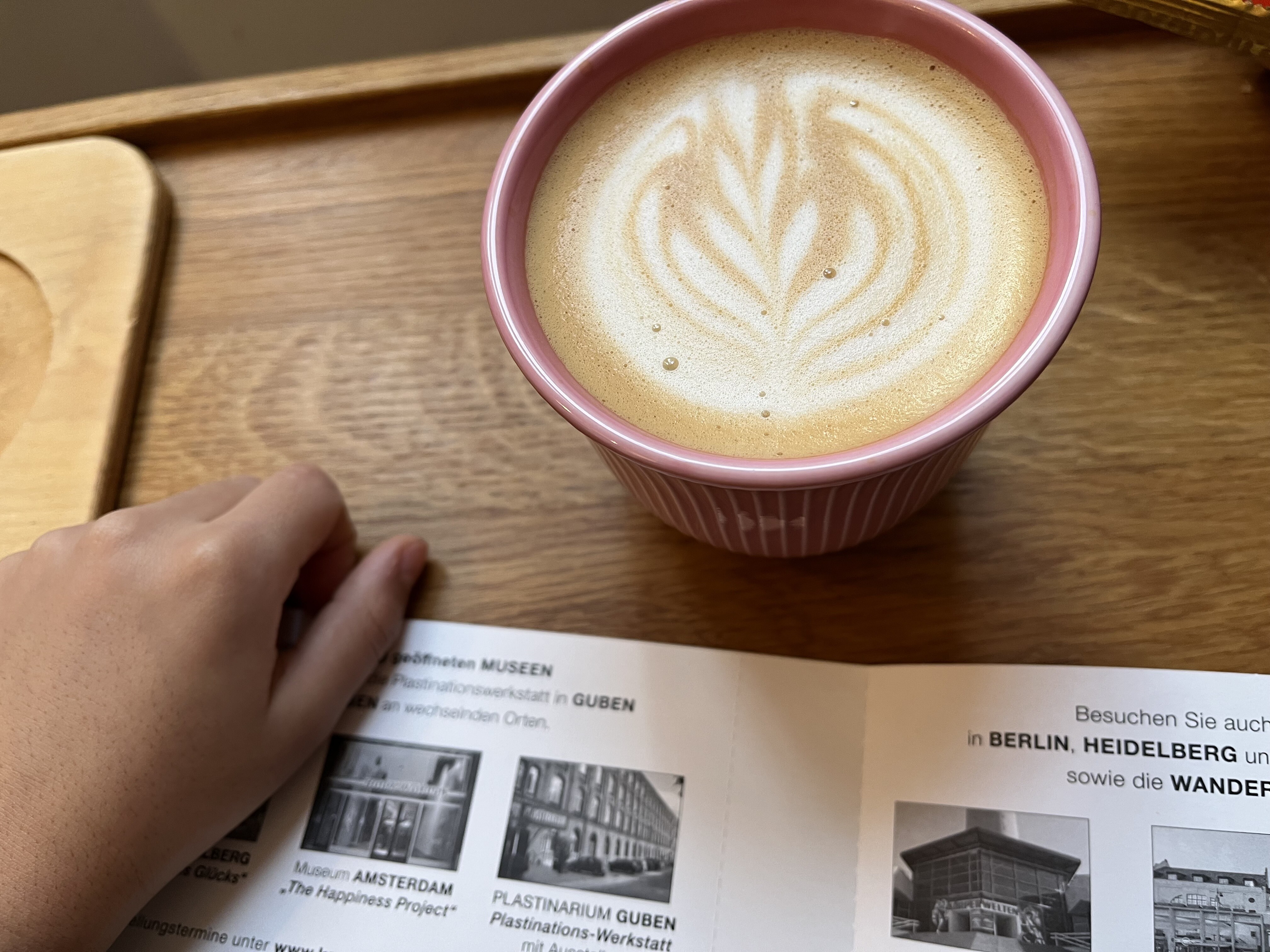 私はミルクコーヒーを飲む。この間行った人体博物館の紹介パンフがあった