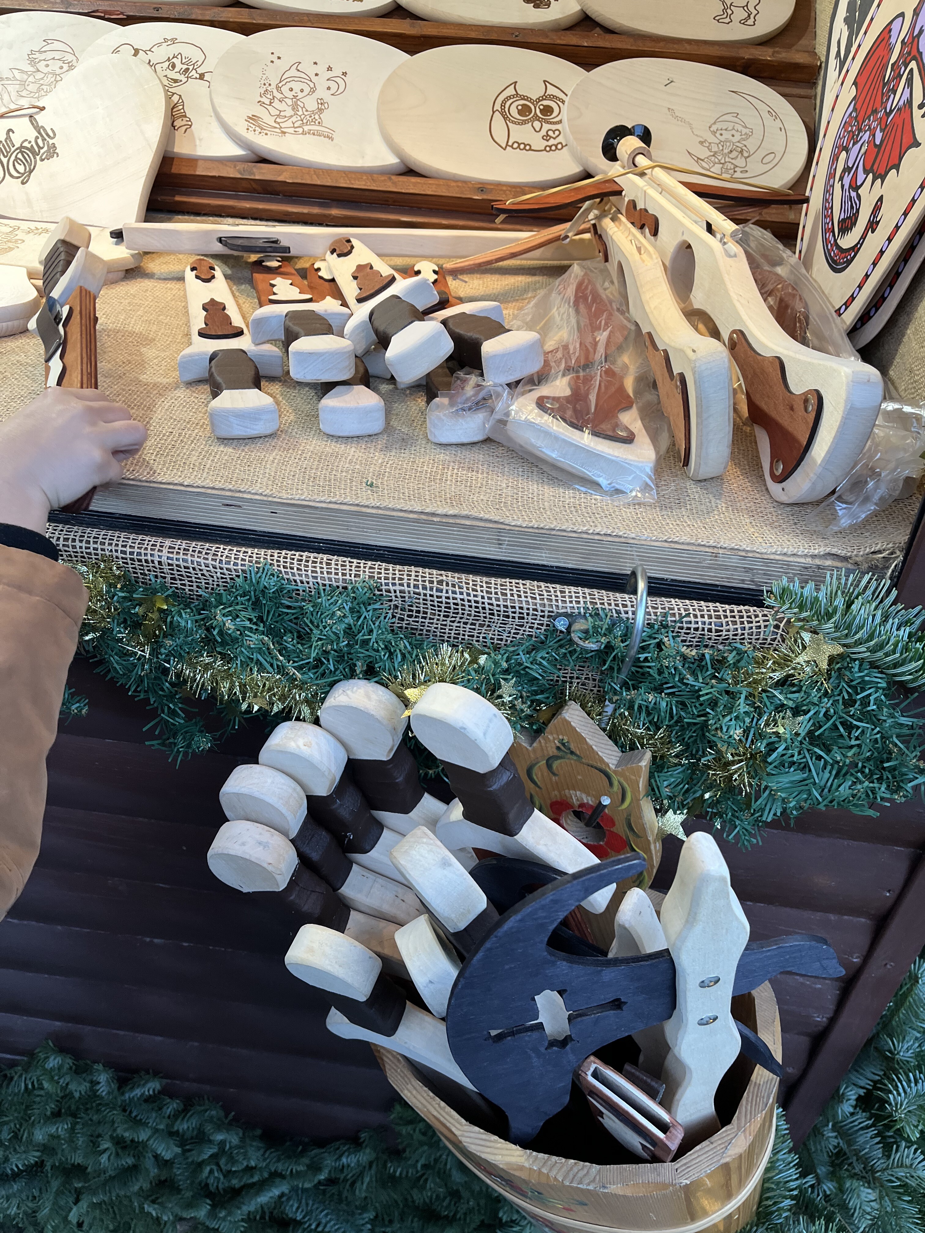さーて次は木製のカッティングボード屋さんがありました。カッティングボードよりも木製の武器が気になるぽよ