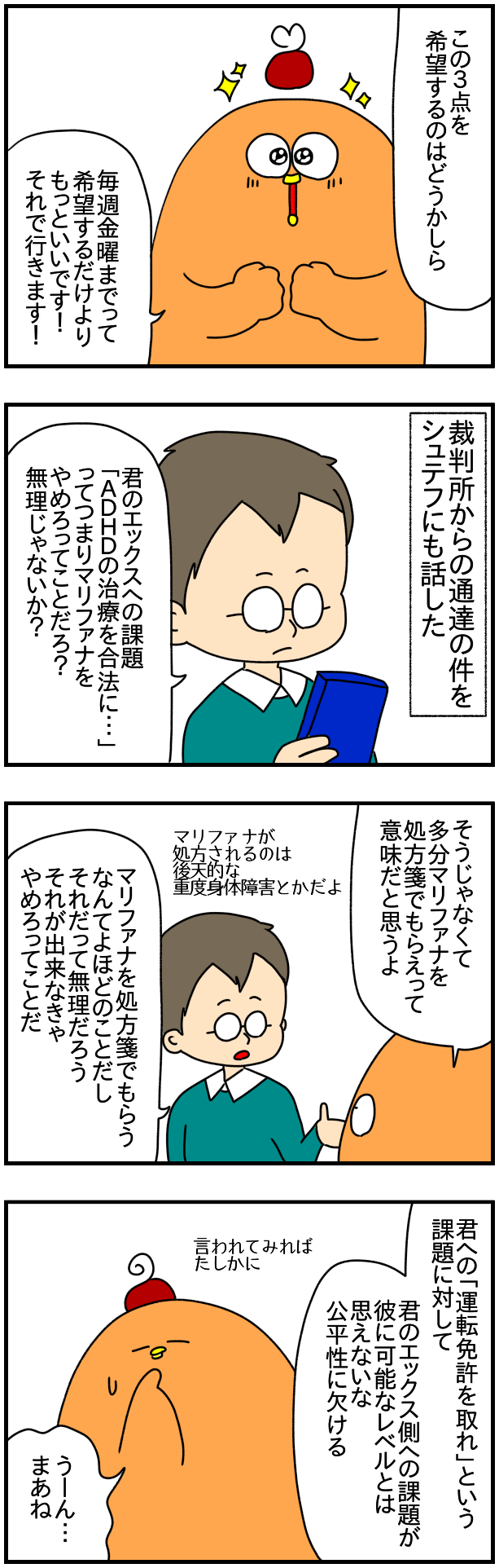 たしかにマリファナはADHD患者に処方される例があるみたいなんだけど、よっぽどのこととか、試験的なものじゃないのかなぁ…エックス自身もよっぽどのことじゃないとマリファナが処方されることは無いって言ってたし
